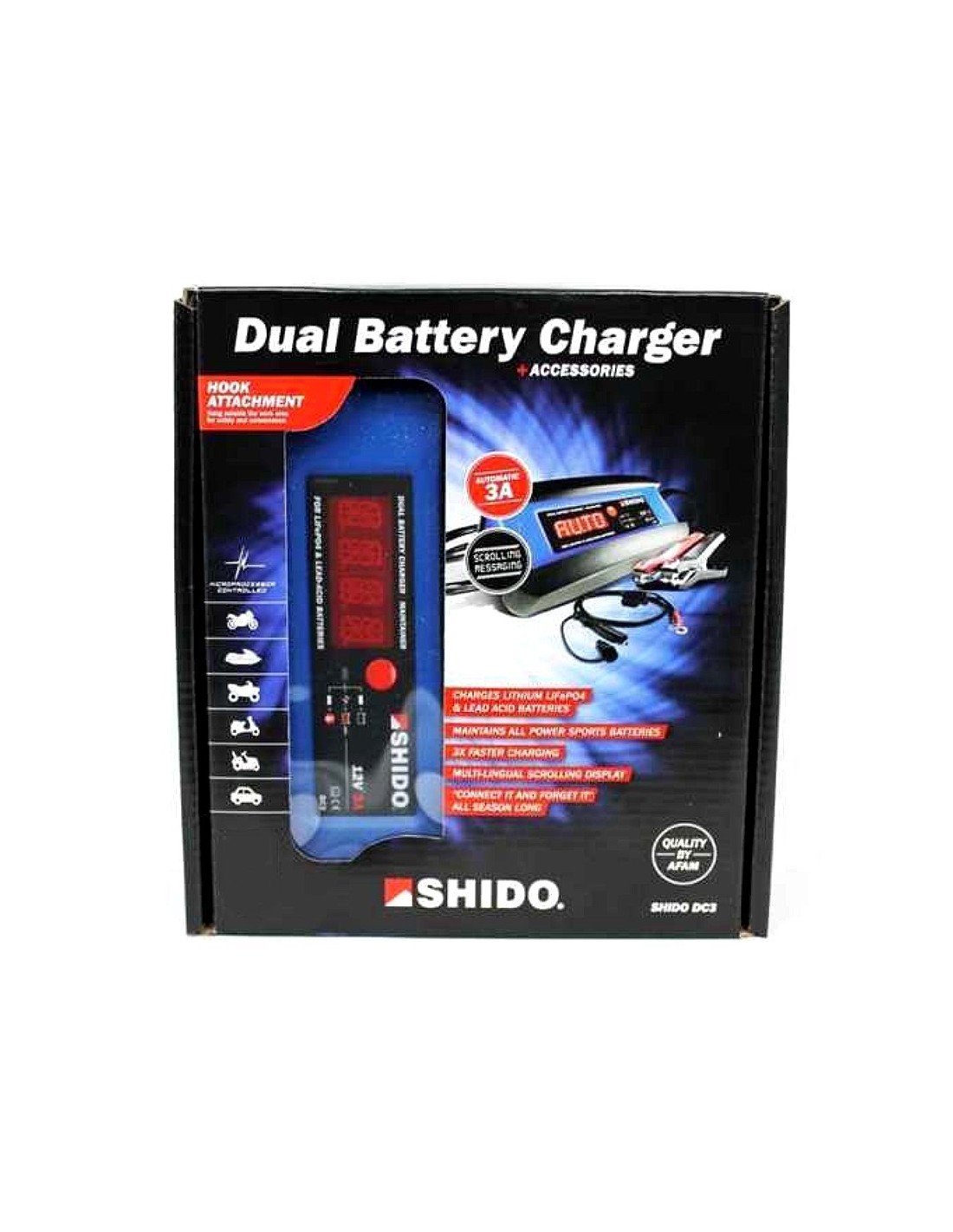 Ce chargeur est entièrement automatique, possède un affichage DEL du processus ainsi qu' une protection contre la surchauffe.